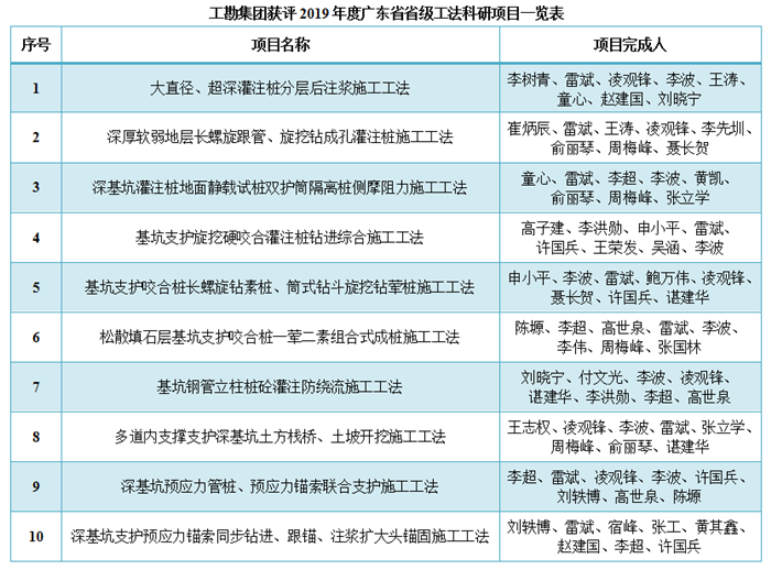 2019年12月12日,2019年度廣東省工程建設(shè)省級(jí)工法名單出爐,工勘集團(tuán)共10項(xiàng)科技研發(fā)項(xiàng)目榜上有名。本年度省級(jí)工法由廣東省住房和城鄉(xiāng)建設(shè)廳組織專家評(píng)審,共受理申報(bào)項(xiàng)目1400項(xiàng),其中696項(xiàng)通過審定并予以公布。