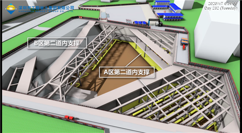 運(yùn)用BIM模型模擬土石方開挖,明確土方開挖順序以及開挖過程中的出土方向。白鵝潭國際金融中心項(xiàng)目土方豎向開挖依據(jù)支撐標(biāo)高分為4個(gè)施工層段,均由基坑非支撐影響區(qū)中心在原開挖面采用后退式開挖。